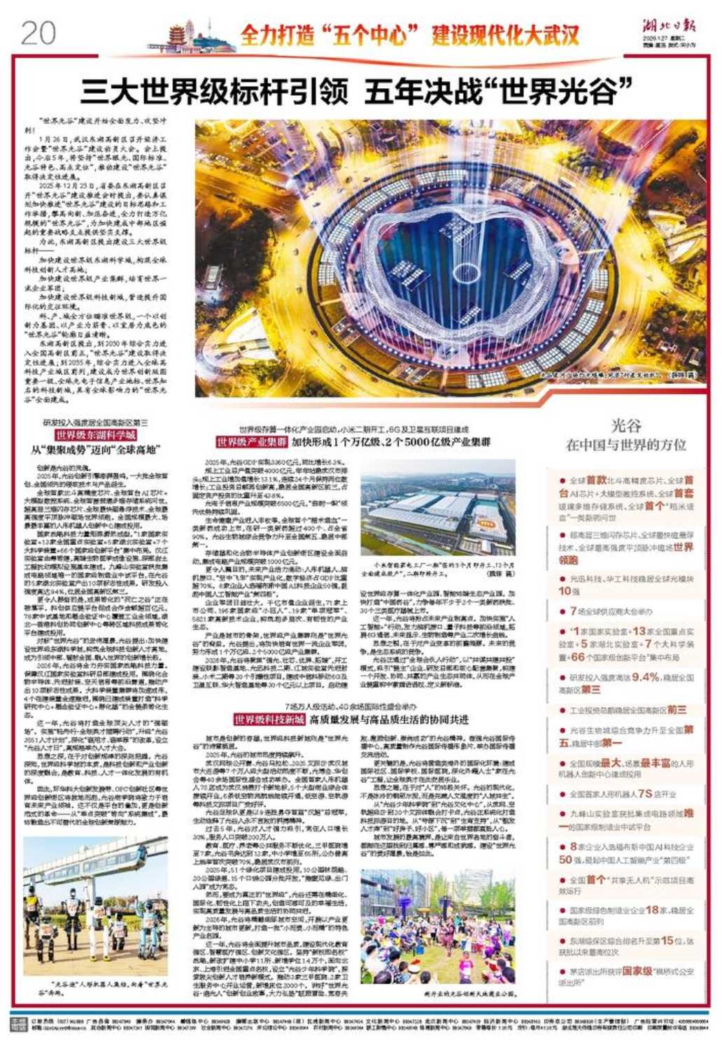 1月27日,《湖北日报》《长江日报》刊发整版报道,回顾光谷“十四五”和2025年工作成绩,介绍“世界光谷”建设和2026年发展规划。以下为全文转载。