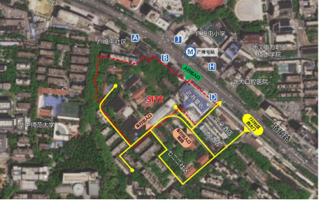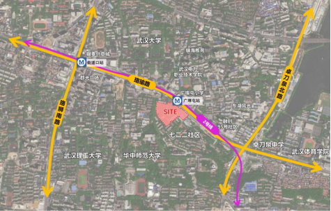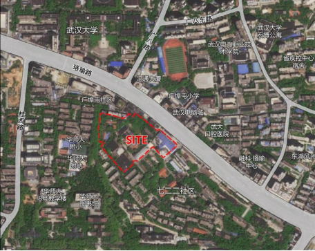 项目用地西侧与南侧与华中师范大学相邻,东侧为七二二社区。地块呈不规则矩形,用地现状为厂房建筑,场地内部整体平整。